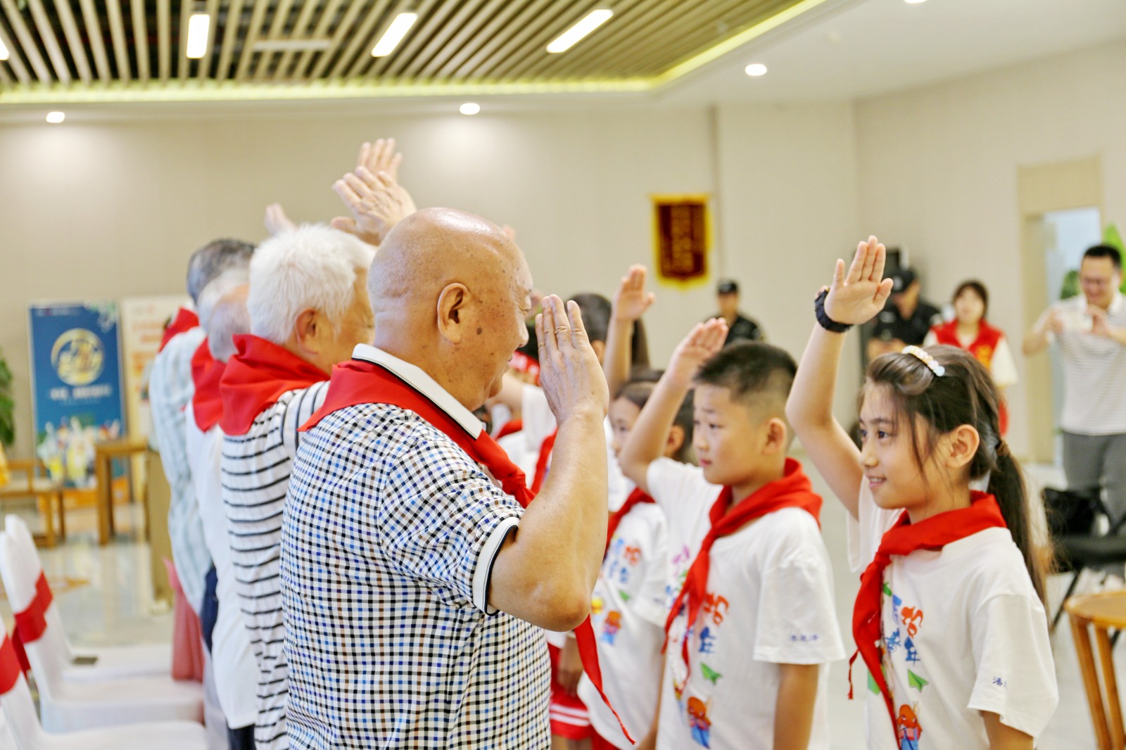 活動(dòng)現(xiàn)場,7名少先隊(duì)員向7名80歲以上的老黨員莊嚴(yán)戴上鮮艷的紅領(lǐng)巾,并隆重的敬上少先隊(duì)隊(duì)禮。老黨員們喜笑顏開、童心未泯,也向少先隊(duì)員們回敬隊(duì)禮。簡潔而隆重的一個(gè)敬禮,真切傳遞著“一老一小”的深情與厚愛。假期托管服務(wù)是西南醫(yī)投集團(tuán)黨委全面貫徹黨的教育方針,落實(shí)立德樹人的根本任務(wù)、推動(dòng)“四下基層”、“我為群眾辦實(shí)事”、關(guān)心下一代工作等落地見效的有力舉措。西南醫(yī)投集團(tuán)直屬黨支部“紅心護(hù)苗”志愿服務(wù)隊(duì)聯(lián)合春江酒城嘉苑養(yǎng)老社區(qū)離退休黨支部“銀發(fā)先鋒”志愿服務(wù)隊(duì),充分發(fā)揮入住園區(qū)的“五老”(老干部、老戰(zhàn)士、老專家、老教師、老模范)優(yōu)勢,將為托管孩子們提供書法、繪畫、傳唱紅色經(jīng)典歌曲、講解優(yōu)秀革命故事、傳承優(yōu)良家風(fēng)家訓(xùn)等課程,引領(lǐng)孩子們知史愛黨、名禮愛國,學(xué)習(xí)感悟百年黨史蘊(yùn)含的紅色文化,汲取紅色力量。